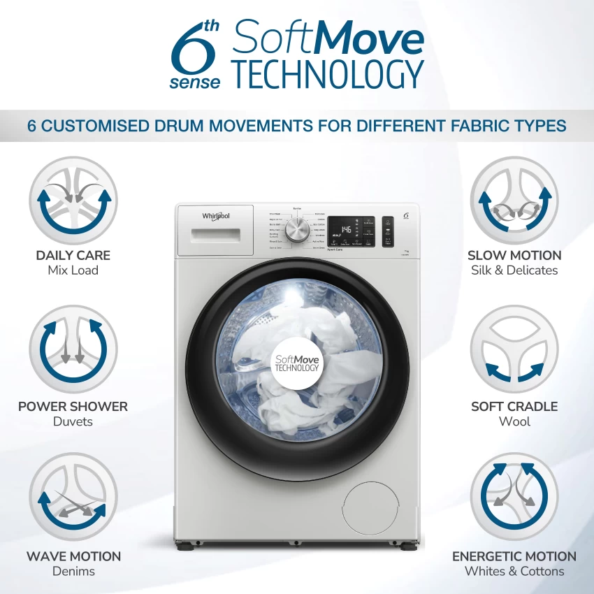 Whirlpool 7 kg Steam Technology 5 Star Inverter 100+ Tough Stains, 6th Sense Soft Move Fully Automatic Front Load Washing Machine with In-built Heater White (XS7010BWW52E)